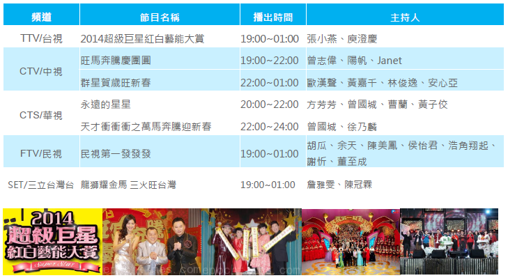 過年期間除夕,2014年各台除夕特別節目仍卯足全力請出大牌偶像,以熱鬧吉祥的歌舞及強檔電影,陪伴民眾渡過2014年除夕的夜晚。以下針對各台除夕特別節目一一介紹。