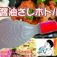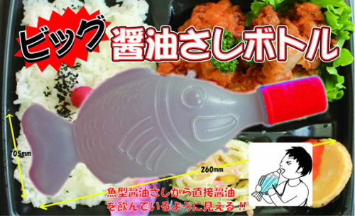 (Brain.com2014-03-11)以前的外帶壽司店,都會附一個小魚醬油罐在壽司盒裡,隨著餐飲成本逐年變高,這些小魚罐子也漸漸消失在市面上,原先這些醬油罐就是設計來給帶便當的民眾放在便當裡使用的,所以尺寸相對來說當然是越小越好(醬油吃多也不好),才不會太占便當裡的位置。日本 Yahoo 的一間網路商店ハイカラ横丁,販售了一款在 twitter 上被瘋狂討論的一項商品,造型就和小魚醬油罐長得一模一樣,但是是超級巨大版!如果真的拿來裝醬油,就是俗稱的家庭號吧!