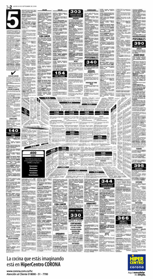 【天天看見好創意】每天刊登職缺、租賃、人事、散工、身份證遺失的報紙分類廣告頁面,也是廣告創意人的好戰場? 哥倫比亞設計師Felipe Salazar為廚具品牌Corona Kitchen,做了一張別具特色的廣告稿。 他利用3D概念,重新排列報紙上的分類廣告。乍看之下,雖然還是分類廣告,但放遠看,就是一個廚房的3D設計示意圖。這個概念也用來傳達,Corona Kitchen可以有效利用空間,讓你的廚房非常精彩。