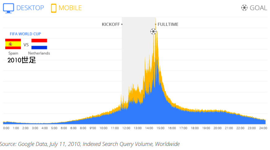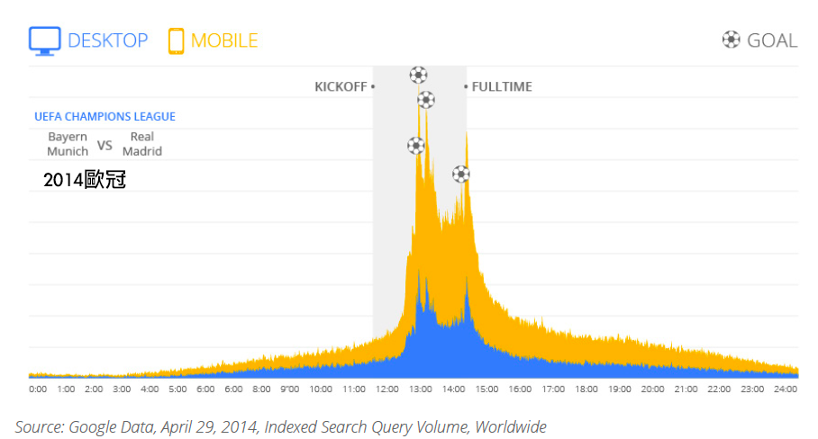 報導指出,相較於4年前網路使用成長53%,Twitter使用成長135倍,臉書用戶數也從3億增加到10億。Google報告顯示,以2010年世界盃決賽和今年歐洲冠軍聯賽 -世足賽前哨站 – 等二場比賽為例,可發現來自行動端的搜尋量,與多屏行為都大幅成長。「行動」將一改今年品牌與消費者互動的樣貌。