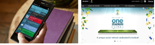 因應社群的興起,SONY推出一個專門為行動裝置打造的線上平台One Stadium Live,將匯集、整理來自推特、臉書和Google+上與世足相關的討論。匯集方式不僅是以關鍵字搜尋,更會分析每篇內容的意義,並歸類相似內容;此舉希望能打造SONY成為世足的社群頻道中心。