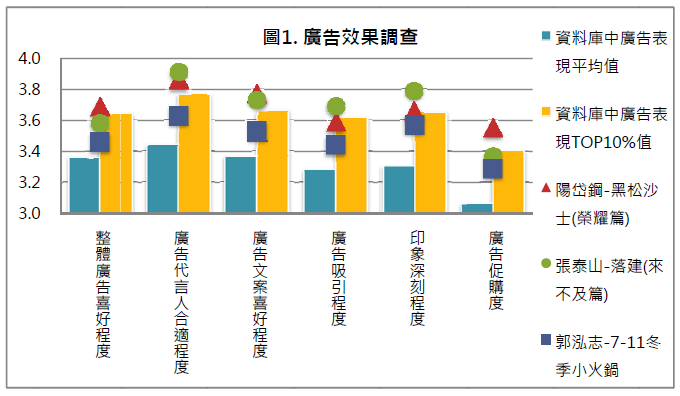 這次調查的三支廣告「陽岱鋼-黑松沙士(榮耀篇)」、「張泰山-落建(來不及篇)」以及「郭泓志-7-ELEVEn冬季小火鍋」廣告表現皆優於EOLembrain東方快線TVC Norm的平均值。廣告指標的表現皆落在所有資料庫廣告的前10%,三支廣告各方面的表現皆相當亮眼。