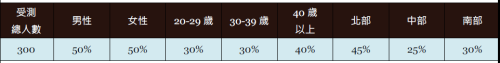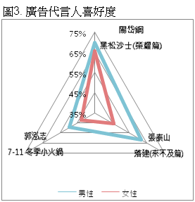 以上調查乃根據EOLembrain東方快線網絡市調於2014年一月份至五月份對市調會員(Panel)所進行的「廣告代言人調查」而得,共有來自全台灣北、中、南部等地區縣市、不同年齡、性別的市調會員參與本次網路調查,樣本組成如下: