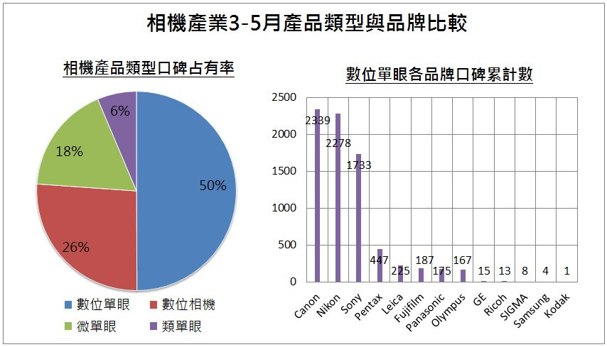 近年來受到智慧型手機與手持式電子產品,在相機畫質與功能上不斷突破的影響,數位相機產業的市場受到一定程度的挑戰。根據i-Buzz口碑報告的調查,可發現目前市場上的熱門相機以日系品牌為主,其中又以數位單眼的網路討論熱度最高,網友經常針對相機的功能與操作,於網路上尋求其他網友建議。