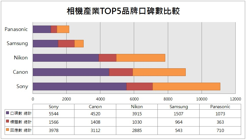 排名第二的Canon雖然標題數與Sony差距不大,但累計口碑卻差了上千筆;緊追在後的是同為日系品牌的Nikon,總計口碑數為3,915筆;第四名Samsung與第五名Panasonic總口碑數則落在1,000~1,500筆之間,兩者間的口碑數差距雖小,但Panasonic的回應數卻遠高於Samsung。