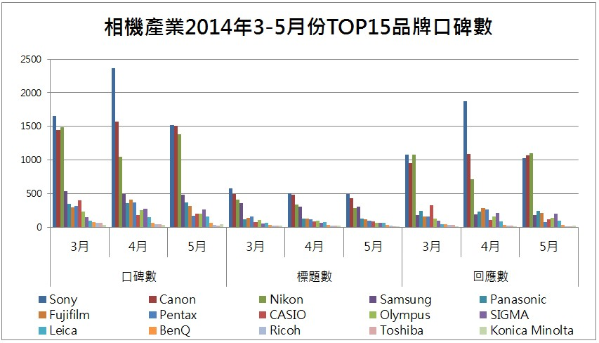 透過圖1可看到相機產業前15大品牌的口碑的排序狀況,在三到五月份中口碑數前三大的日系品牌Sony、Canon、Nikon各月份討論量累計皆超過一千筆,表現較其他韓系Samsung、德系Leica、台系BenQ等競爭對手差距明顯。