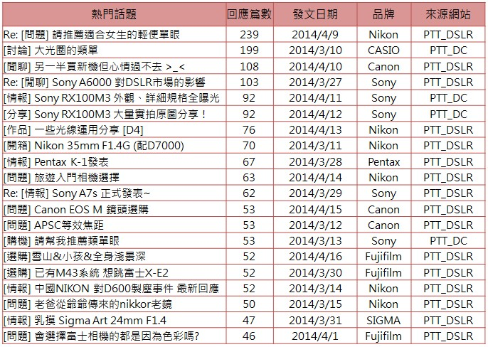 接著要來探討網友的熱門相機話題,由表可看出排名前20名的來源以PPT為主,話題多為開箱文與發問。