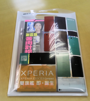 Sony Mobile為Z3上市,特別與壹週刊合作,製作手提式L夾,以特殊廣告模式,增強吸睛魅力。正面透明一部份讓壹週刊Logo及封面露出,維持媒體品牌形象;背面則擺滿不同顏色新機種;最後則是能拆成L型文件夾。(圖/Brain.com攝影)