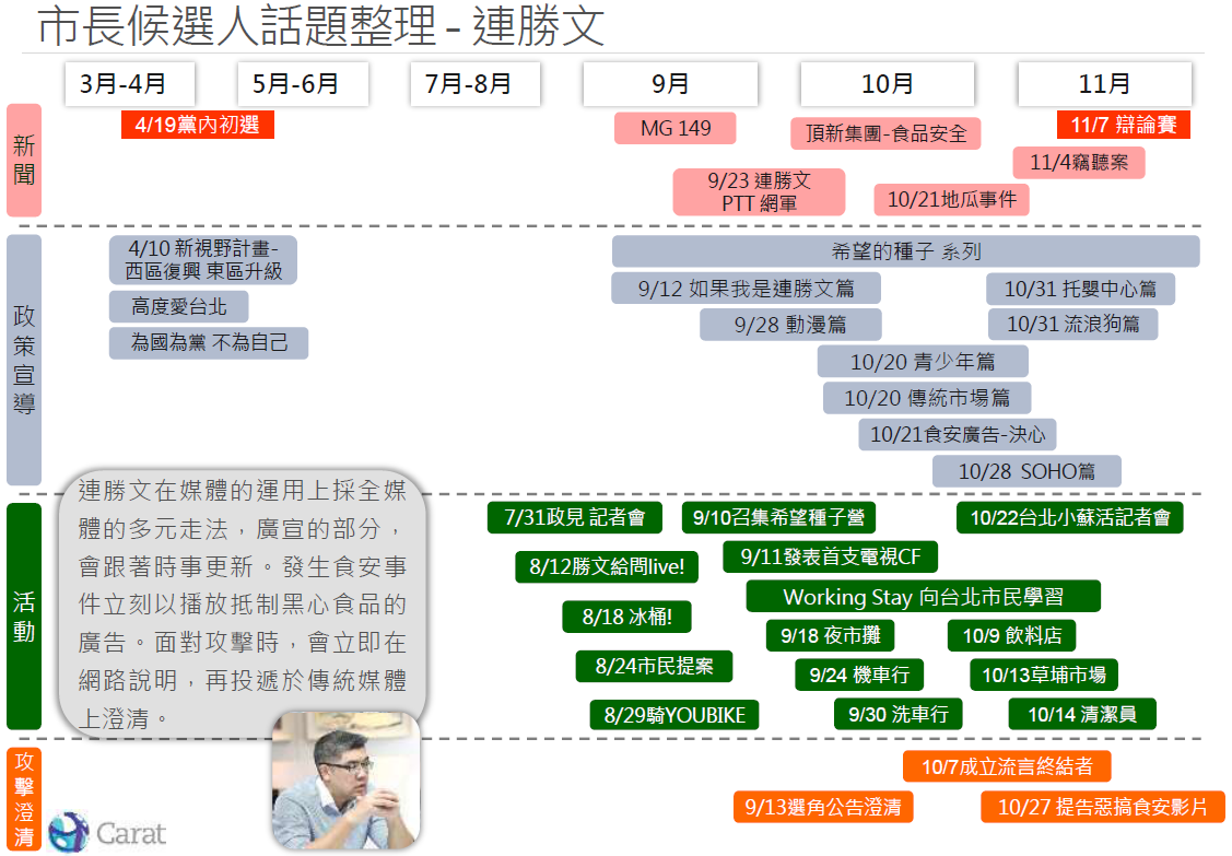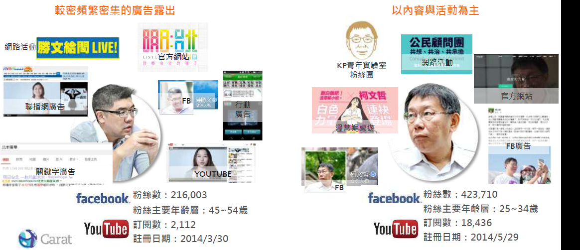 連勝文以投遞廣告涵蓋大部分網路媒體(手機、影音、新聞、搜尋引擎關鍵字、社群網站);柯文哲則是集中於內容溝通與實體活動,讓話題自然發酵,由民眾自動分享擴散出去。