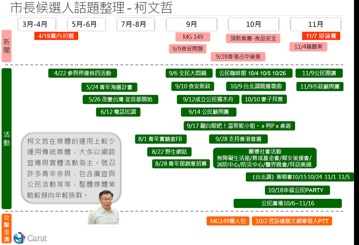 本篇專題將先「爬梳」二位候選人在11月7日辯論會前的相關議題,分析辯論會的收視狀況,最後比較兩位臺北市市長候選人的媒體策略。