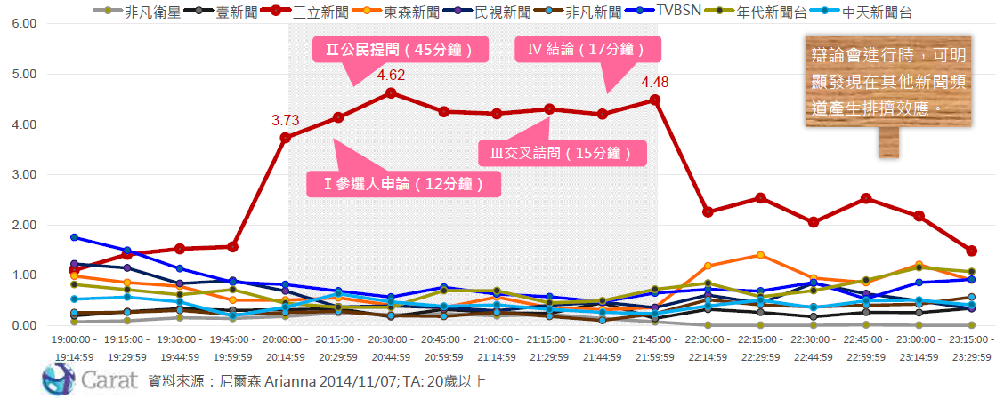這次台北市候選人辯論會受到高度關注與討論,4歲以上的平均收視率為3.57,20歲以上的選民收視率最高達4.62,超越總統大選辯論會。