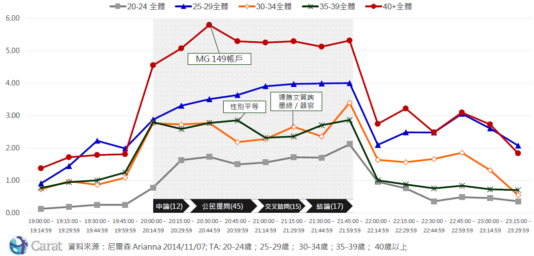將觀眾分為5個族群,20-24歲首投族、25-29歲青年族、30-34歲熟齡族、35-39歲中堅族、40歲以上的定見族。以收視表現來看,以40歲以上的定見族收視最高;25-29歲次之,而30-34歲與35-39歲為中度關心。