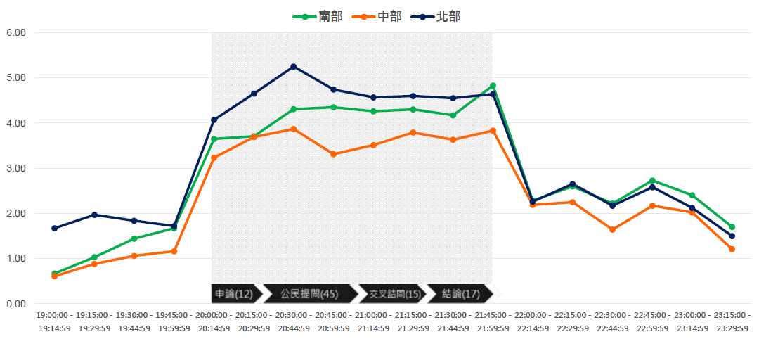 將20歲以上觀眾分為北、中、南三區比較,北部收視明顯突出,但中南部的觀眾對這次辯論會的關心度也高;對照2012年總統大選辯論會時,南部收視最高為1,北部為1.5,最高為中部2.5。