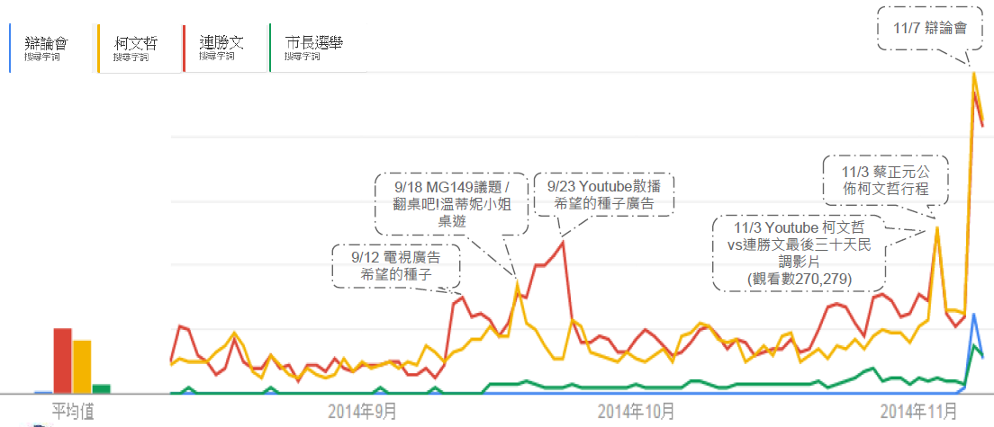從議題上來看,連勝文在推出新廣告時都有熱絡的討論與搜尋,引起話題;而柯文哲則是在一般網路議題上的操作持續維持聲量,兩人的搜尋量也在11月7日的候選人辯論會當天達到高峰。