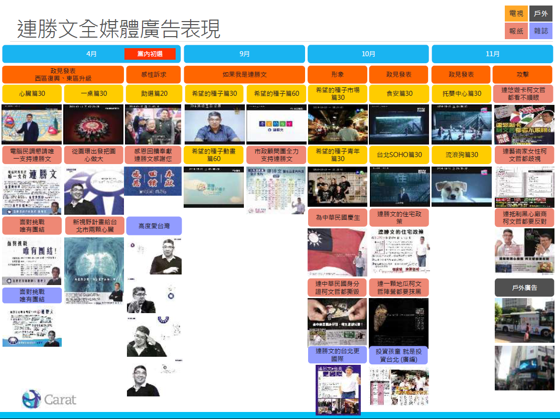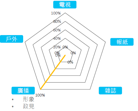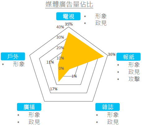 運用電視(35%)與報紙(36%)廣告快速建立個人形象、知名度及溝通政見理念,廣告同時搭配使用網路影音聯播網、YouTube,補足年輕族群的收看頻次。