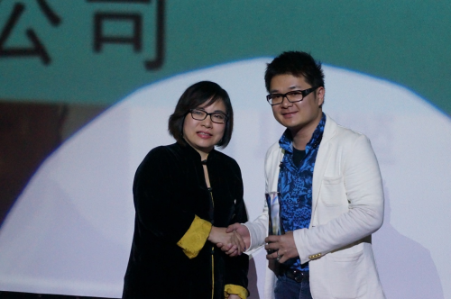 左起:旺旺中時傳媒(北京)總經理的林淑黛頒獎給時間軸營運長陳顥仁領獎(圖/DMA提供)