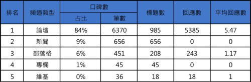 由下表一可看出時尚產業口碑的頻道類型,第一名與其他產業的頻道類型大致相同,皆以「論壇」為主要的口碑來源,共有6,370筆討論數,占比高達全部頻道類型的84%,平均回應數5.47也是其中最高的,反映出論壇屬於眾人分享訊息、討論交流的平台。