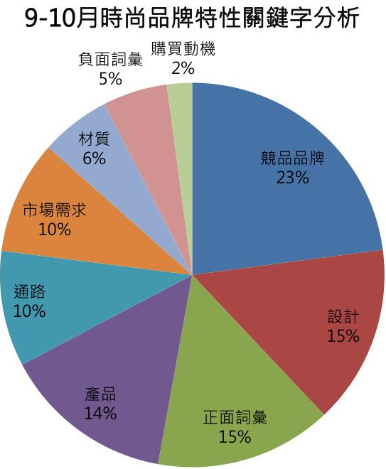 根據下圖三的時尚產業品牌特性關鍵字,可以發現名列前三的關鍵字種類分別為「競品品牌、設計、正面詞彙」。其中「競品品牌」占口碑數比例的最大宗,從9-10月前二十名的熱門話題中即可窺出端倪,如「[問題] Lativ跟uniqlo的緊身褲」,消費者會先比較這兩個品牌緊身褲的優、缺點。