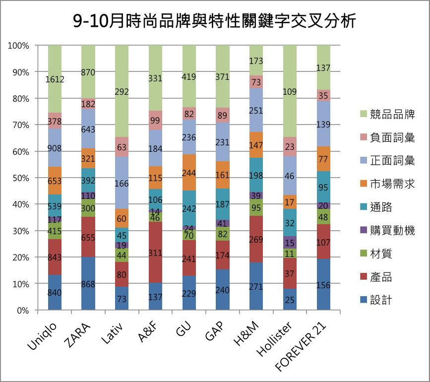 值得注意的是,由於GU在九月進入台灣,因此從圖表中可以發現其口碑數一度超越A&F、GAP,然而討論熱度似乎不持久,於隔月口碑數隨即掉至倒數第二名,僅以些微差距贏過尚未在台展店的FOREVER 21。