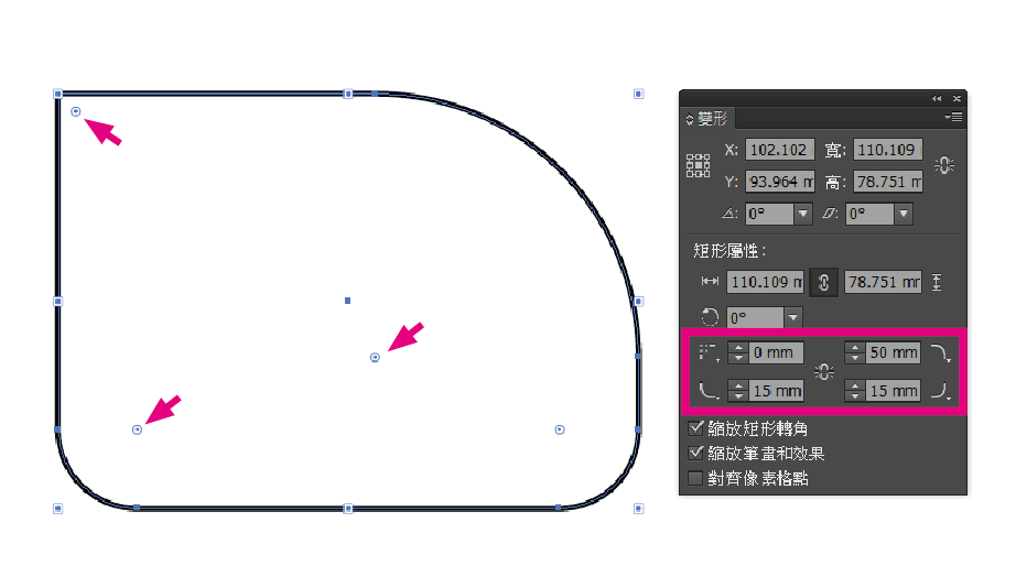 以往若要把畫好的90度直角,變成圓角,都要重新用貝茲曲線來繪製,中途若要改變圓角半徑,又需要許多步驟,才能達成。現在有了即時轉角功能,只要將畫好的矩形,選取圖中紅色箭頭紙的圓點,透過拖拉,就可以隨意調整圓角的大小,也可以利用變形工具列,依照依照所需的尺寸,更改紅框內的數值,來設定圓角半徑。是不是方便了很多!
