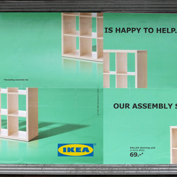 IKEA與德國廣告公司thjnk這次推出的平面廣告,就是將一張正常的產品廣告切成四部分,互相調換位置。即使上面的文字被打亂,也不難看出上面的標語寫著:「我們的組裝服務很樂意幫忙。」