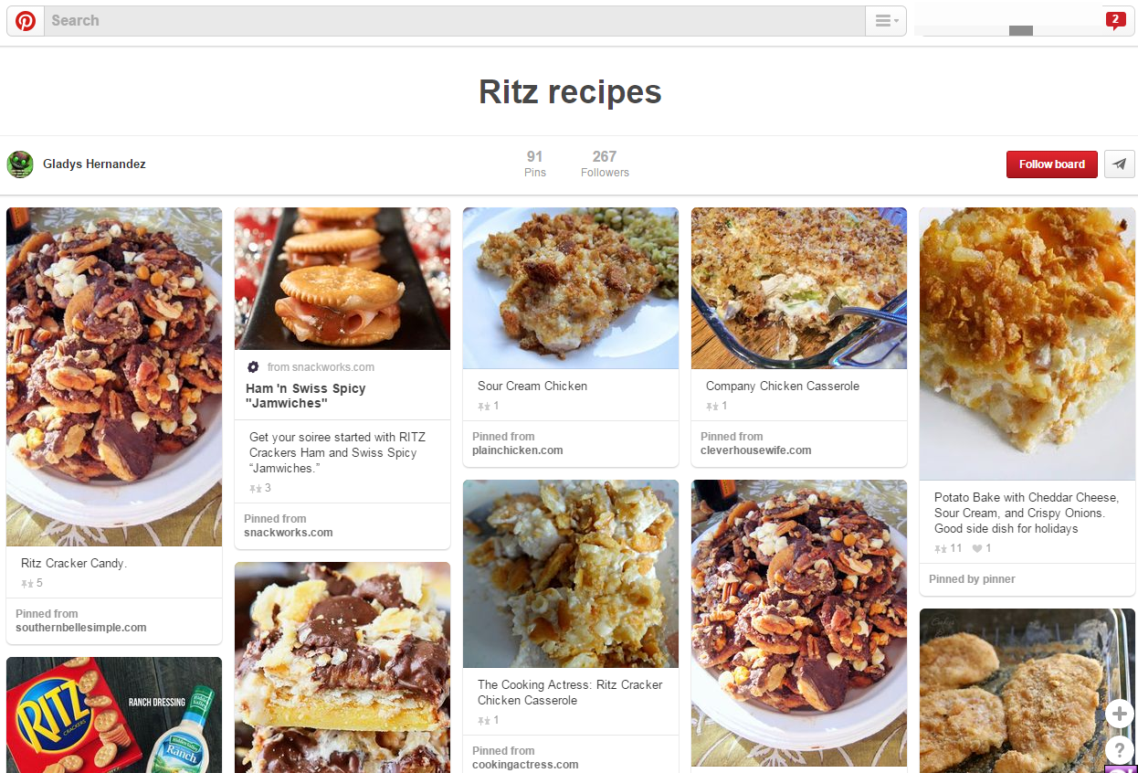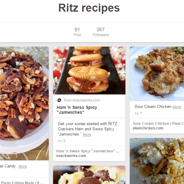知名的麗滋餅乾(Ritz Crackers)在Pinterest發起了一項活動,邀請大家一起分享麗滋餅乾新吃法,最後共募集了843種的相關圖釘訊息,挖掘出好幾百種的創新好滋味,也重新凝聚釘友對品牌的向心力。