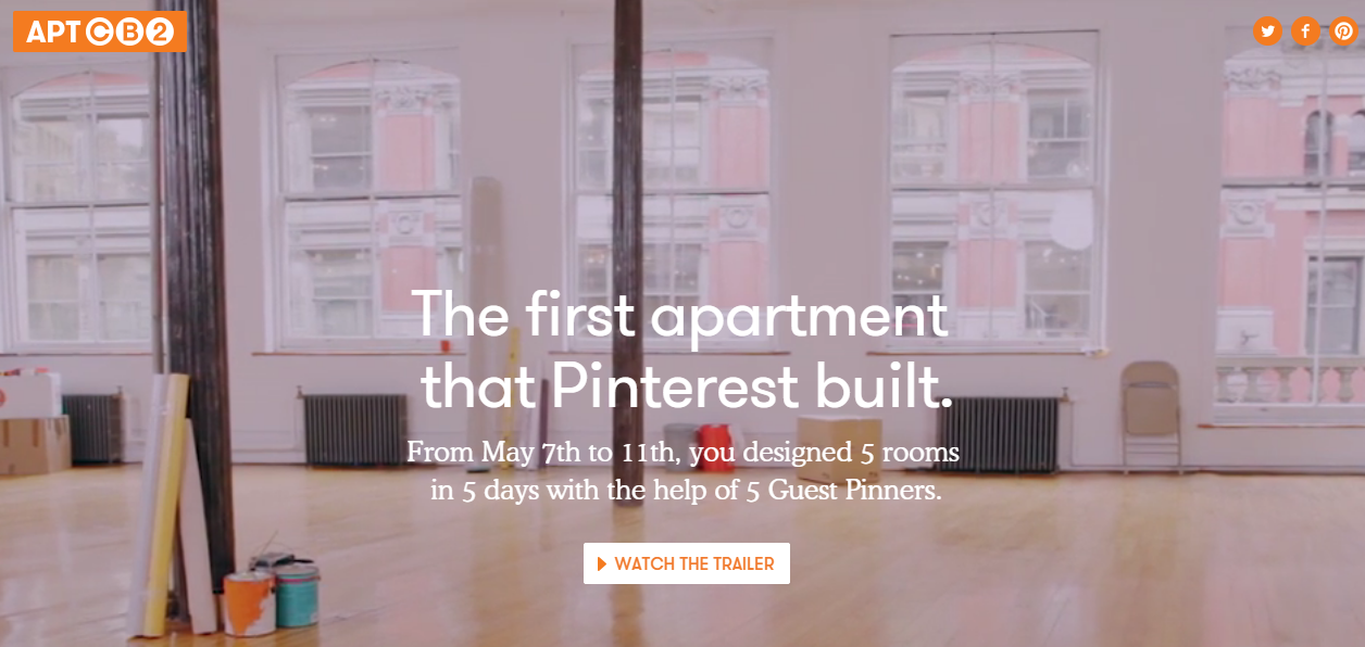 2014年美國居家設計品牌CB2攜手Pinterest,打破線上創意社群與線下生活的疆界,邀請釘友透過五天票選,參與紐約一間夢幻公寓的設計,由Pinterest上的五位知名的設計師,使用釘友票選出的家具,至分配的公寓空間中設計布置。