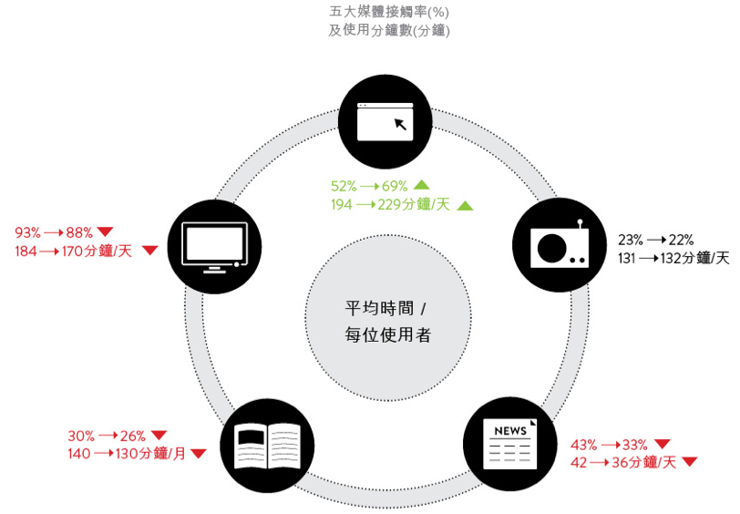相反的,網路雖然是台灣消費者接觸率第二的媒體,上網比例較2010年的52%增加了17個百分點至2014年的69%,且平均每天上網時間更接近4小時—達3小時又49分鐘,也就是一天扣除睡眠的8小時後,幾乎有四分之一的時間都在上網。