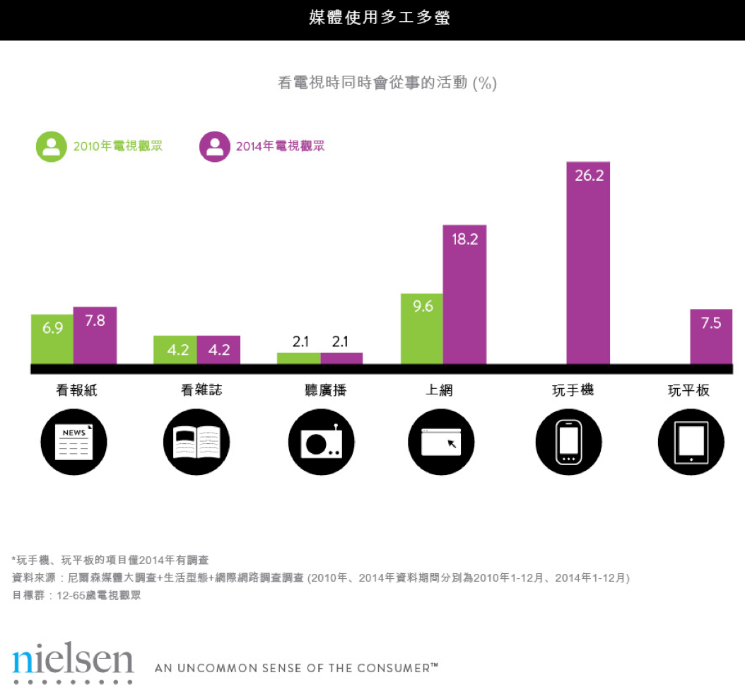 消費者在觀看電視的同時,還會玩手機(26.2%)、看報紙(7.8%)、平板(7.5%)、雜誌(4.2%)、還有聽廣播(2.1%),還會上網(18.2%),而且看電視同時上網的比例較2010年增加近一倍。