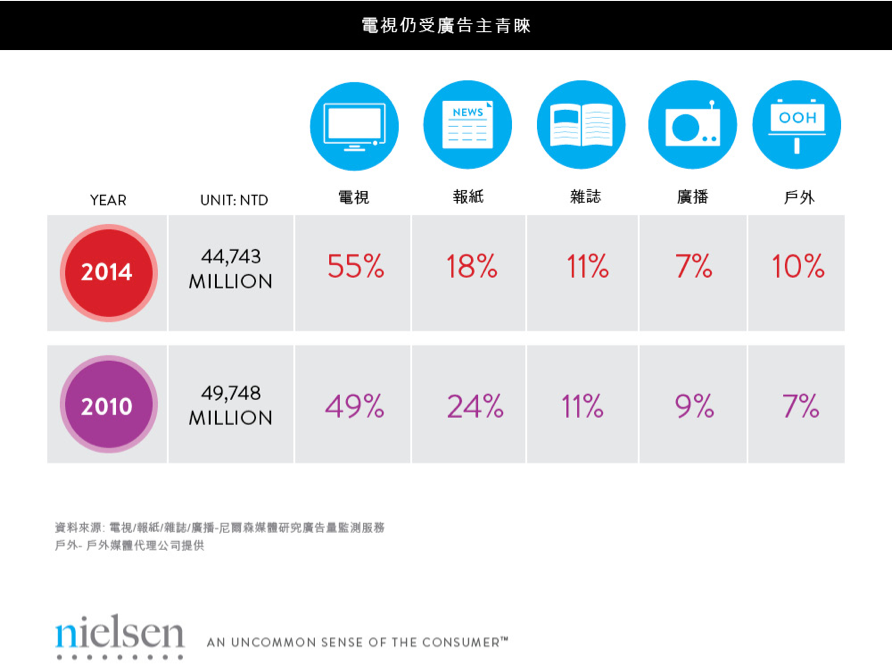 雖然上網的比例與時間遽增,但由於電視接觸比例仍高達88%,依舊是廣告主與消費者溝通與行銷的主要媒體,廣告佔比更有增加的趨勢,從2010年的49%增加到2014年的55%。