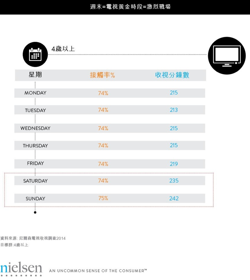 根據尼爾森電視收視調查,周六與周日可說是電視最關鍵的黃金戰場,因為消費者觀看電視的時間從周間的每天約215分鐘左右,在周末增加到235至242分鐘,時間足足多了20分鐘左右。