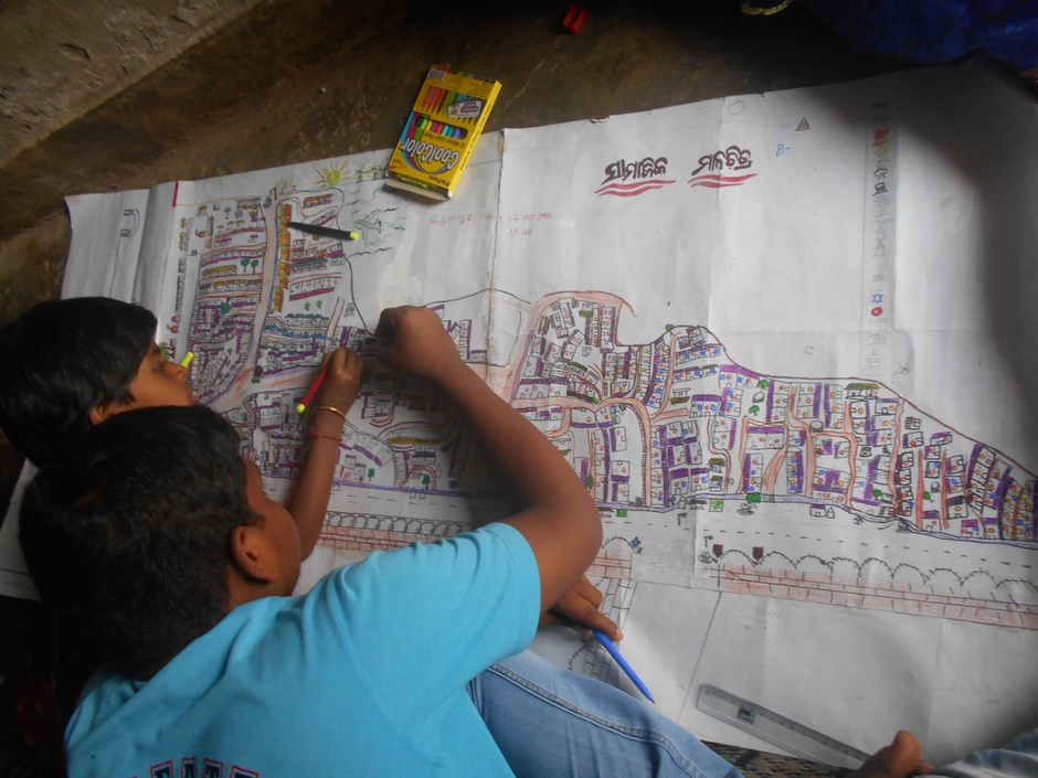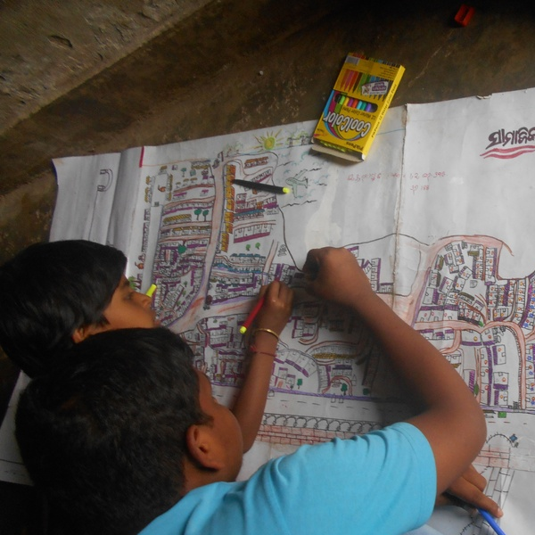 Humara Bachpan組織成員帶領孩子們手工繪製地圖,他們花了四十五天的時間,徹底走訪整個貧民街區,觀察社區、街道是如何相連與不相連的,他們記錄下觀察到的事情,並將之繪製成地圖。