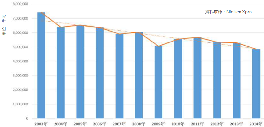 (Brain.com 2015-04-13)雜誌廣告量從2003年74億新台幣,明顯下滑至2014年不到50億;近24億新台幣的廣告量,在11年間消失於雜誌廣告市場。