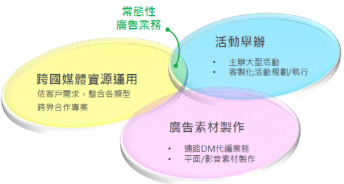 除常態性廣告業務外,雜誌媒體的360度多元整合服務主要包括三大面向:活動舉辦、廣告素材製作、與國內外媒體集團資源運用。