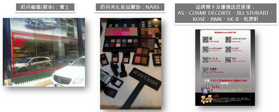 活動冠名、產品贊助、時尚櫥窗(裝飾藝術)與百貨櫃點活動推播,是廣告主較常合作模式。