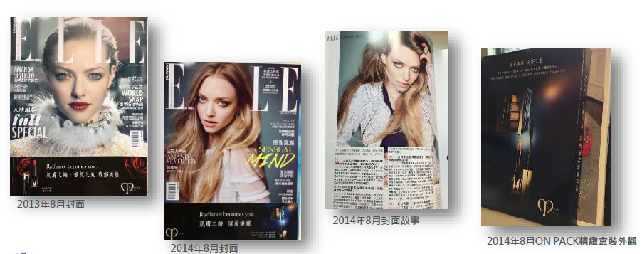 肌膚之鑰全球代言人無法前來亞洲區曝光,透過國際中文版ELLE香港版及英國版封面人物拍攝,連續兩年,由ELLE協力出面進行跨國照片授權及刊載於台灣區封面,專案內文帶出品牌代言人訊息,進一步讓台灣讀者認識其代言人,並搭配禮盒的On-pack專案,加深品牌全球化印象並可望接觸新客層。