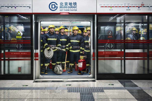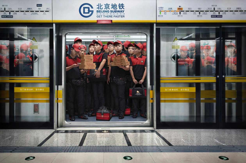 三張作品上,可以分別看到消防員、醫護人員,以及比薩快樂送的員工,通通擠上北京地鐵。