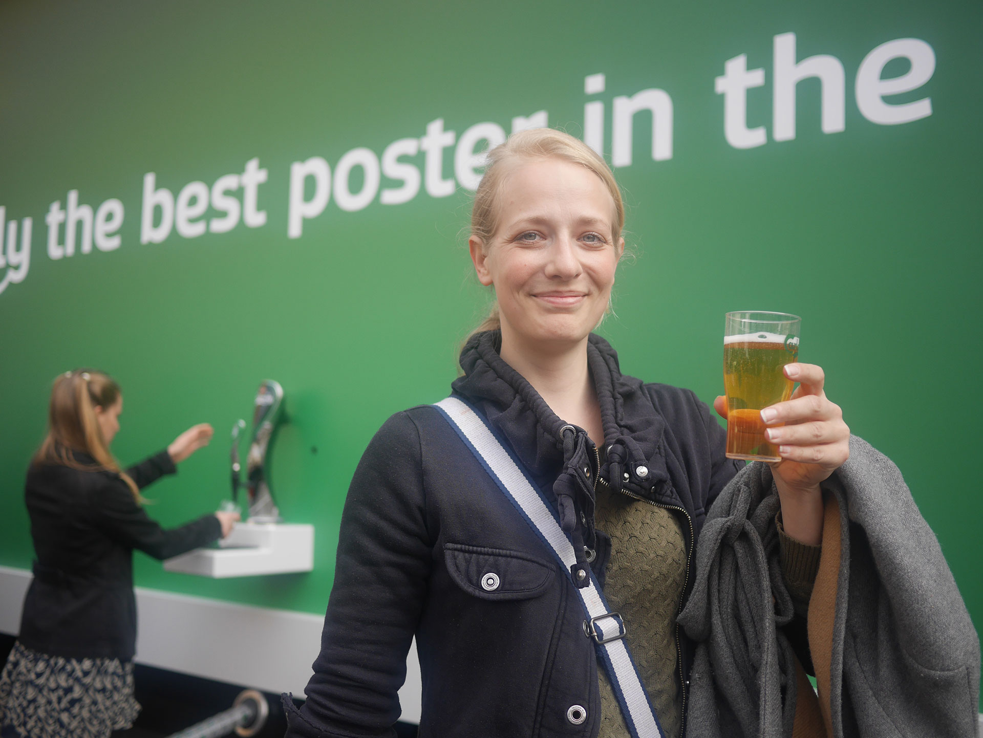 為何敢這樣說?原來是海報前方,嘉士伯提供免費的啤酒,人們可以扭開水龍頭,自己裝來喝。為了防止有18歲以下的小朋友來偷嘗「禁酒」,嘉士伯請人在旁邊監控。