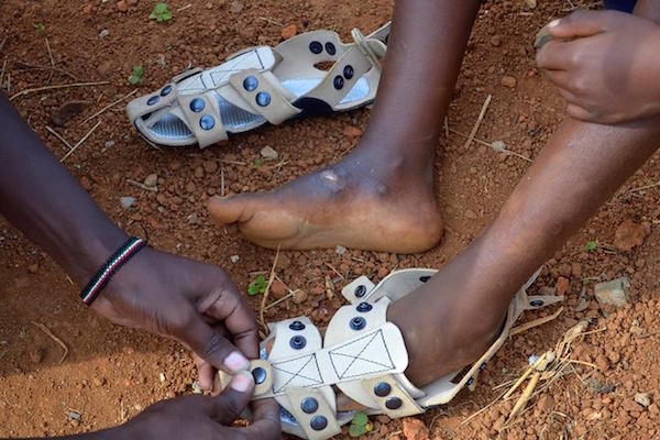 美國設計師 Kenton Lee 在肯亞工作時,就親眼看見那些家境貧困的孩子,因為沒錢買新鞋,只能穿著破洞或尺寸過小的鞋子,腳趾全裸露在外面,或乾脆把鞋子脫掉,赤腳走在泥土地上,導致腳上滿是擦傷和潰瘍。於是他想,有沒有可能有一雙鞋子,可以調節和伸縮,讓孩子們從小穿到大,永遠可以保護住他們的雙腳?