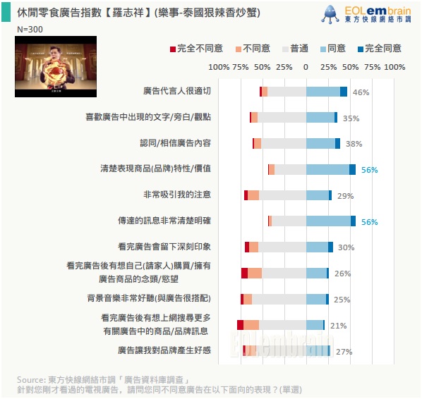 EOLembrain東方快線長期進行廣告代言人與廣告後測的調查,本次調查從資料庫中挑選三支休閒零食廣告:羅志祥-樂事-泰國狠辣香炒蟹、炎亞綸-卡迪那-茄汁薯條(壁咚篇)、橘平屋-劈啪舞(散貨篇),以下將從調查結果探討廣告的表現: