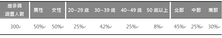 以上調查乃根據EOLembrain東方快線網絡市調於2014年4月針對市調會員(Panel)所進行的「廣告大調查」而得,共有來自全台灣北、中、南部等地區縣市、不同年齡、性別的市調會員參與本次網路調查,樣本組成如下: