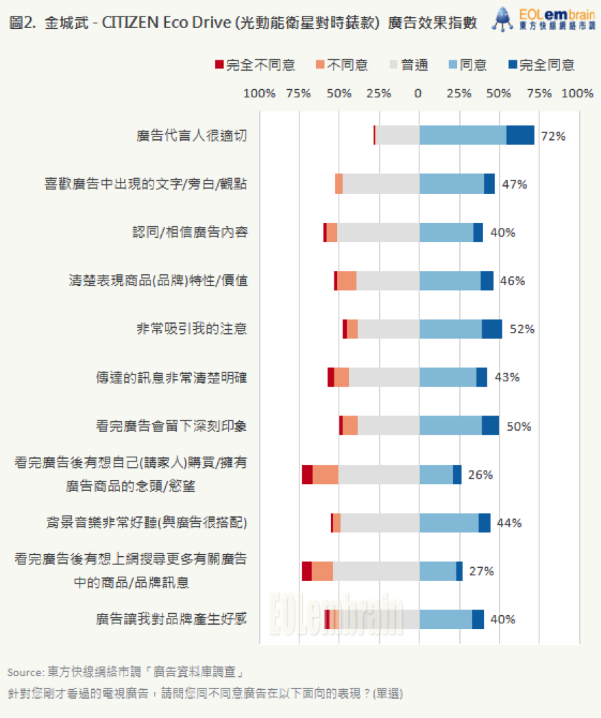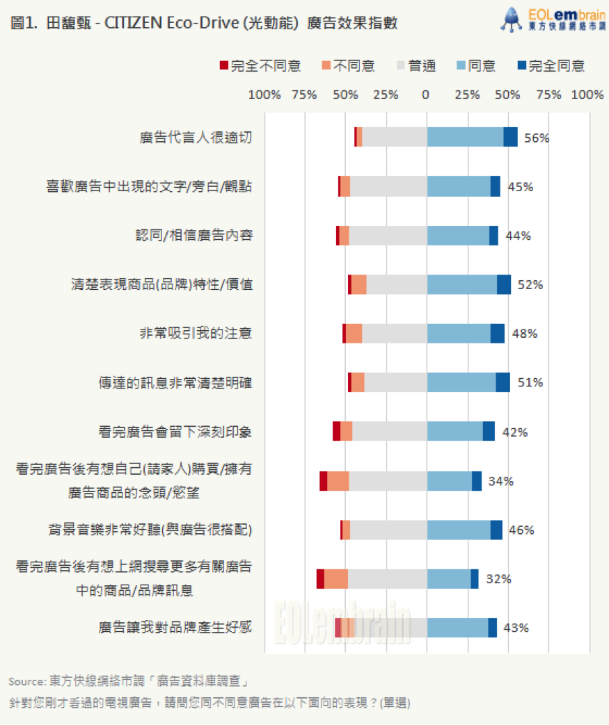 本周 EOLembrain 東方快線於廣告後測資料庫中,挑選兩支近期的手錶廣告:【田馥甄-CITIZEN-Eco-Drive 光動能】與【金城武-CITIZEN-Eco-Drive 光動能衛星對時錶款】,調查結果如下: