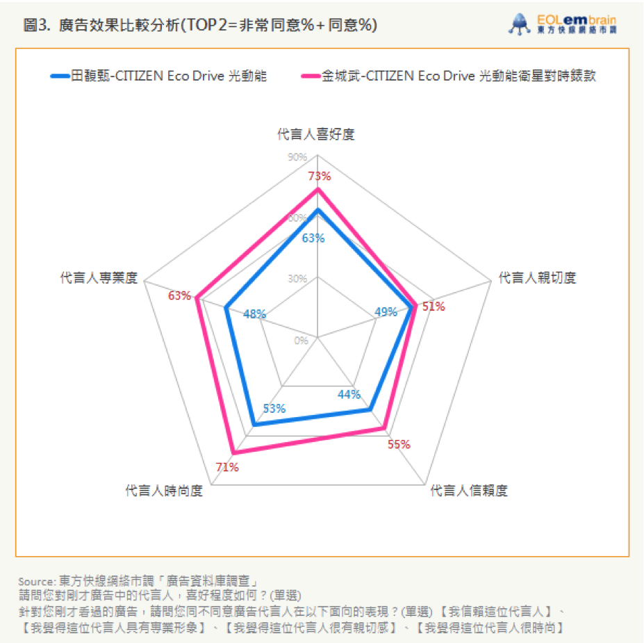 比較兩支 CITIZEN-Eco-Drive 分別由田馥甄與金城武所代言的手錶廣告發現,各項代言人指標皆有近五成以上的比例。