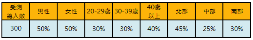 以上調查乃根據 EOLembrain 東方快線網絡市調於2015年4月對市調會員(Panel)所進行的「廣告後測大調查」而得,共有來自全台灣北、中、南部等地區縣市、不同年齡、性別的市調會員參與本次網路調查,樣本組成如下:
