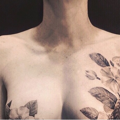 這個客戶叫做 Adriana ,因為罹患乳癌,不得不接受乳房切除手術。她請 David Allen 運用刺青師的創作才華,幫忙設計專屬的圖案,來掩蓋她胸部上的傷疤。
