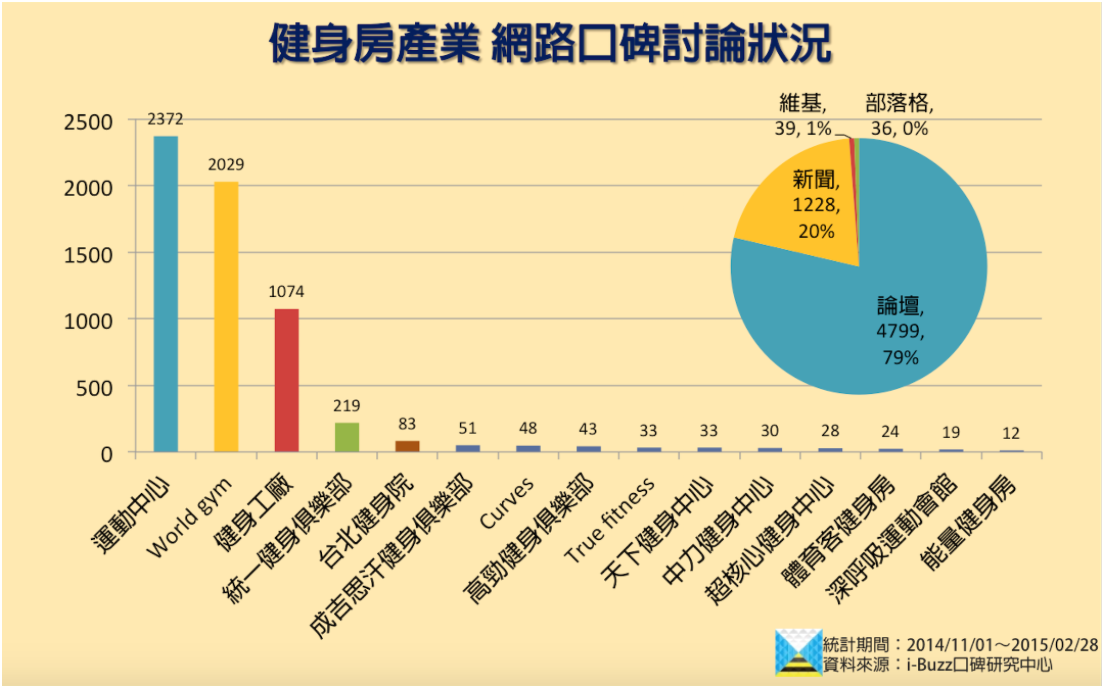 i-Buzz口碑研究中心監測了健身房產業,包括公辦民營的「運動中心」,共有十九個品牌。透過網路數據顯示,口碑占比由「運動中心」奪冠,共獲得2,372筆聲量;其次是「World Gym」與「健身工廠」。其他品牌的口碑量則與前三名差距十分懸殊。