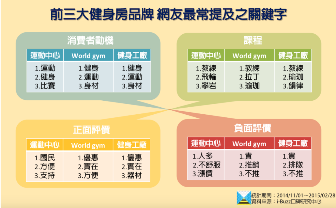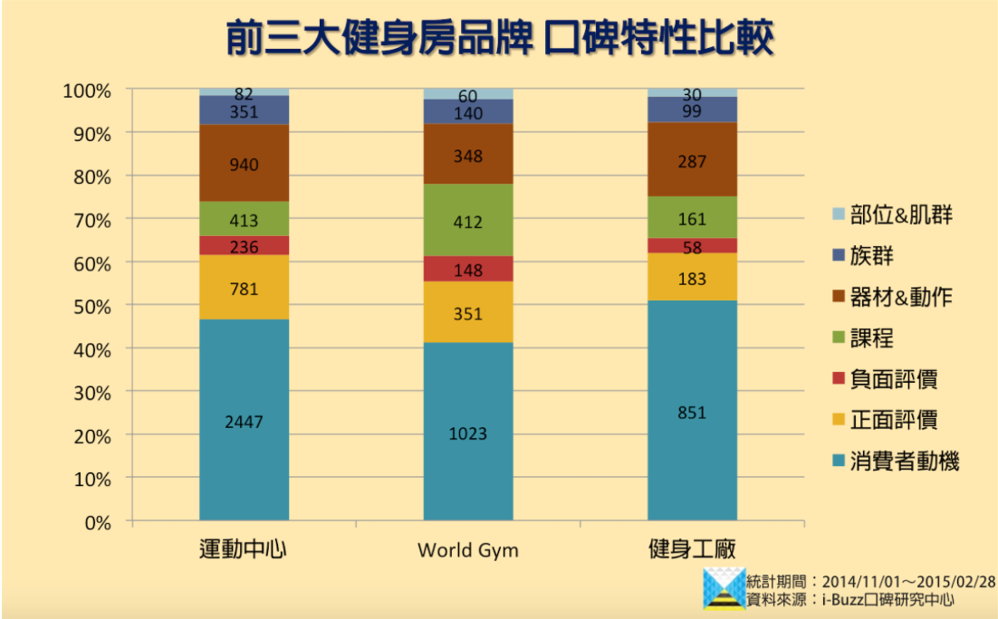 「正面評價」中,運動中心與World Gym多了「方便」的關鍵字,運動中心據點橫跨各縣市區域,World Gym則是目前所有俱樂部型健身房中據點最多的品牌,顯示交通方便也是消費者考量的因素之一。