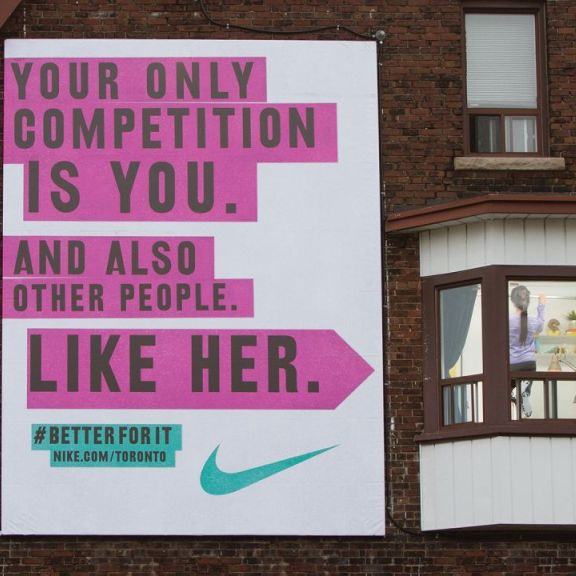 Nike「#betterforit」活動的主要目的,是鼓勵女性投入健身運動,他們租下看板旁邊的公寓小房間,裡頭裝著一個拉單槓的機器模特兒,看板上的文案寫著:「妳只需要和自己競爭,當然妳也可以和其他人競爭,例如,她(箭頭指向公寓內不停拉單槓的假人)。」