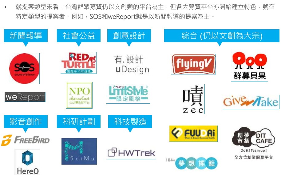 就提案類型來看,台灣群眾募資仍以文創類的平台為主,但各大募資平台亦開始建立特色,號召特定類型的提案者,例如,SOS 和 weReport 就是以新聞報導的提案為主。