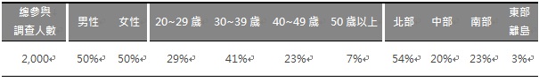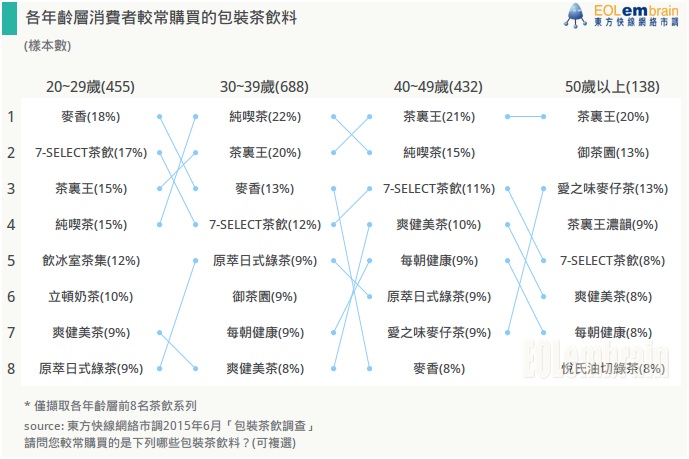 以上調查乃根據 EOLembrain 東方快線網絡市調於2015年6月針對市調會員(Panel)所進行的「包裝茶飲調查」而得,共有來自全台灣北、中、南、東部等地區縣市、不同年齡、性別的市調會員參與本次網路調查,樣本組成如下: